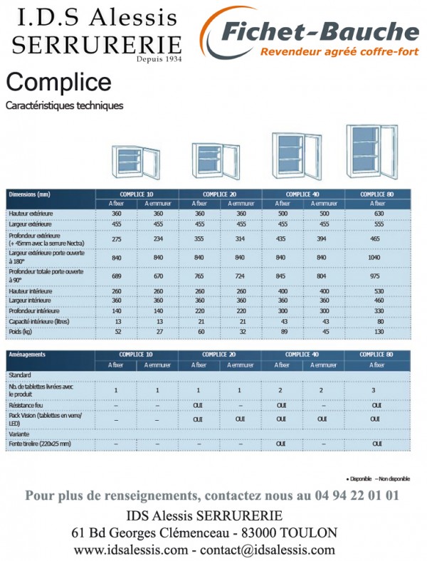 Le coffre-fort haute sécurité de marque Fichet-Bauche modèle Complice est disponible en 4 volumes, de 10 à 80 litres. Fabriqué en France et certifié résistant au vol et au feu, il est spécialement conçu pour la protection de vos biens et valeurs.