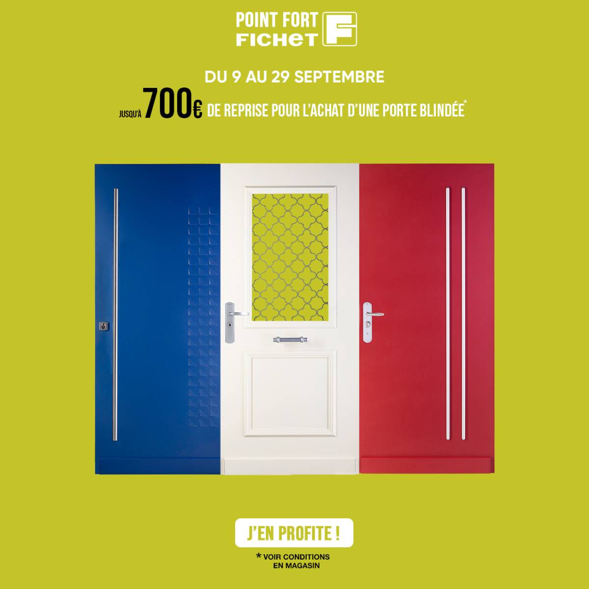 Du 9 au 29 septembre 2025, profitez d'une promotion exceptionnelle : la reprise de votre ancienne porte peut vous faire économiser jusqu'à 700 € HT sur l'achat d'un bloc porte blindé FICHET !